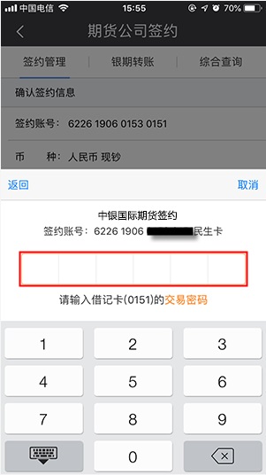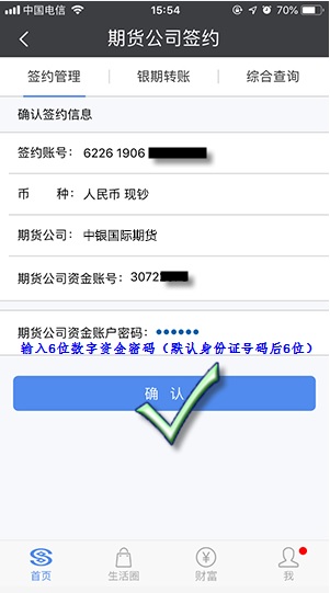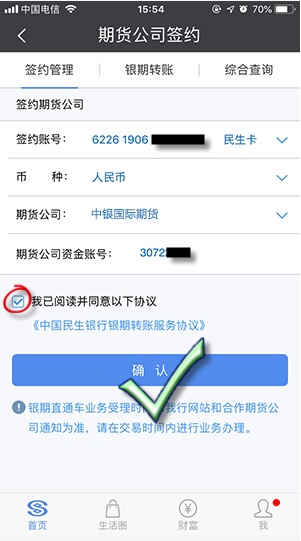 5.選擇簽約賬戶,期貨公(gōng)司選擇“中(zhōng)銀國(guó)際期貨”,輸入期貨資金賬号(中(zhōng)銀期貨資金賬号為(wèi)8位或9位數字),勾選已閱讀協議并點擊“确認”;