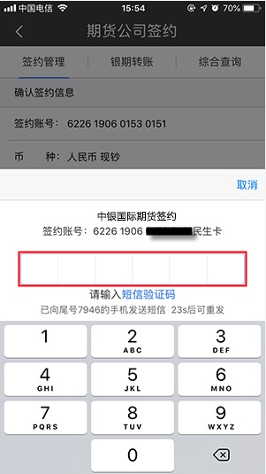 7. 根據提示輸入短信驗證碼與銀行交易密碼,完成銀期簽約。